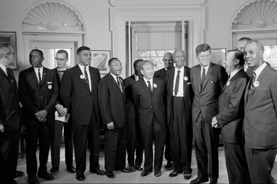 President John F. Kennedy stands with a group of leaders of the March on Washington at the White House. From left are Whitney Young, National Urban League; Martin Luther King Jr., Southern Christian Leadership Conference; John Lewis, Student Non-violent Coordinating Committee; Rabbi Joachim Prinz, American Jewish Congress; Dr. Eugene P. Donnaly, National Council of Churches; A. Philip Randolph, AFL-CIO vice president; Kennedy; Walter Reuther, United Auto Workers; Vice-President Johnson, rear, and Roy Wilkins, NAACP. (AP Photo)